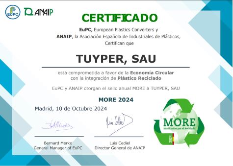 TUYPER ha sido galardonado con el Sello y Certificado MORE, como miembro de la plataforma europea lanzada por EuPC (European Plastics Converters) y coordinada en España por ANAIP. Gracias a esta plataforma es posible monitorizar y promover el uso de materiales reciclados por parte de los transformadores de plásticos, demostrando nuestro compromiso con la Economía Circular.