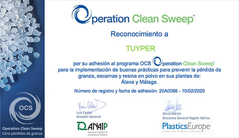 TUYPER se encuentra adherido al programa OCS (Operation Clean Sweep), una iniciativa mundial de la industria de los plásticos para evitar la emisión al medio ambiente de partículas de plástico (granza, escamas, polvo). OCS es un compromiso voluntario para la gestión responsable, cuya finalidad es la de ayudar a que en todas las operaciones en las que se manipule granza de plástico se apliquen buenas prácticas de limpieza y control, evitando así que se produzcan fugas al medio ambiente.